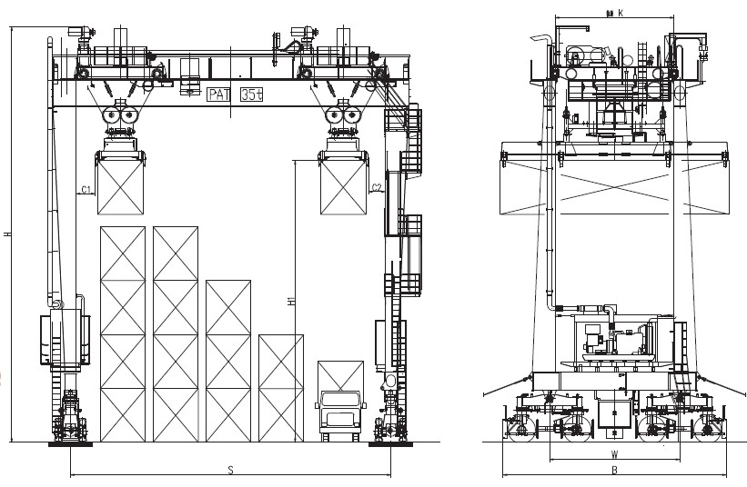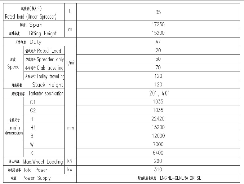 2、 采用專用集裝箱吊具,可起吊20、40、45標(biāo)準(zhǔn)集裝箱及液壓儲(chǔ)存罐。